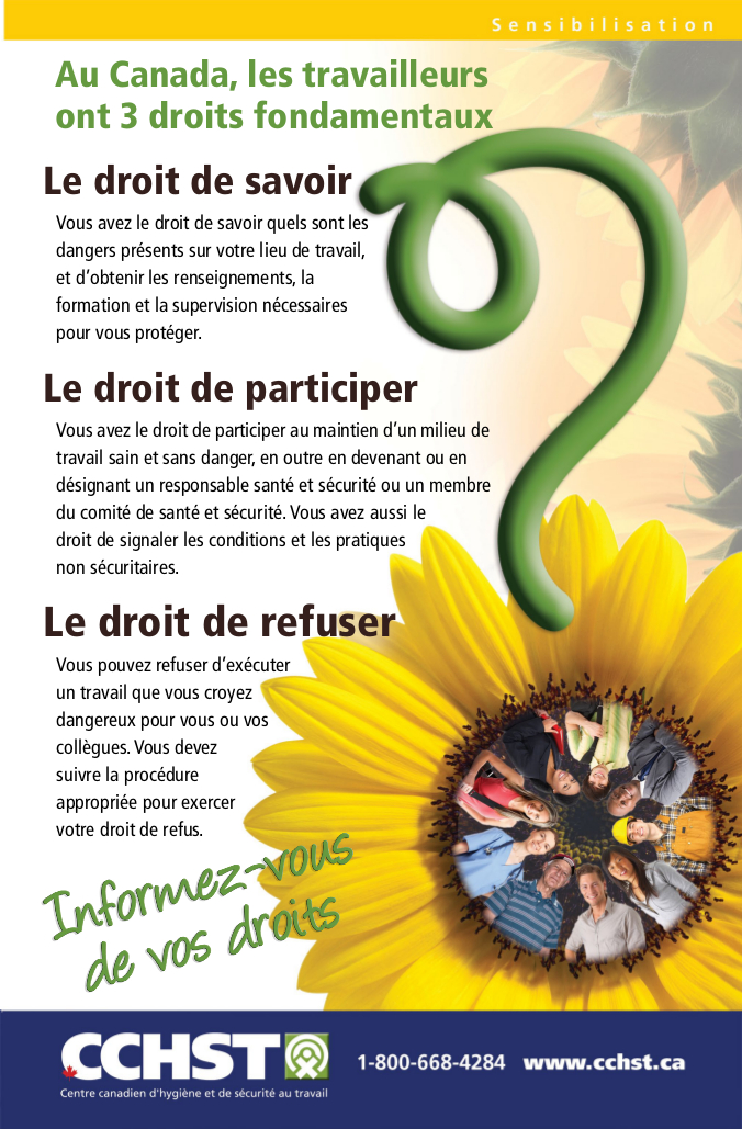 Le Centre canadien d'hygiène et de sécurité au travail (CCHST) a publié une affiche en anglais et en français décrivant trois droits incontestables dont jouissent les employés canadiens en matière de sécurité au travail. Savez-vous de quoi il s'agit ?
