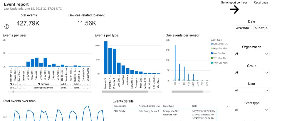 Ce rapport fournit une vue d'ensemble de haut niveau de toutes les données collectées à partir d'une flotte de détecteurs de gaz G7 sur le terrain. Les équipes peuvent approfondir leur analyse à l'aide d'une série de filtres pour afficher les informations qui leur sont importantes, notamment les événements par utilisateur, groupe, organisation, type de données et même type de capteur de gaz. Le rapport affiche les tendances des données au fil du temps afin que les entreprises puissent surveiller la manière dont les employés utilisent les équipements de détection de gaz, les maintenir en état de fonctionnement et identifier facilement les domaines susceptibles d'être optimisés.
