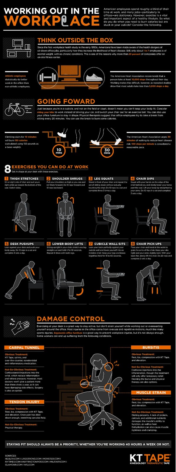 Faites-vous suffisamment d'exercice au travail ? Cette infographie publiée par Mashable présente plusieurs façons de rester actif si vous passez trop de temps assis pendant votre journée de travail. N'oubliez pas de prendre le temps chaque jour d'étirer vos muscles et de faire un peu d'exercice ! Cela peut vous aider à prévenir certaines maladies telles que les maladies cardiaques et le diabète, à éviter les blessures et à réduire le risque de dépression.